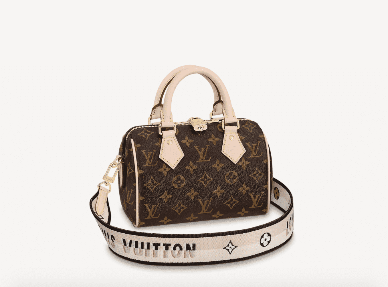 The Speedy 20 B in monogram comes with a wide detachable textile strap with a woven Louis Vuitton signature ; which makes the bag quite cool and casual, even slightly sporty.